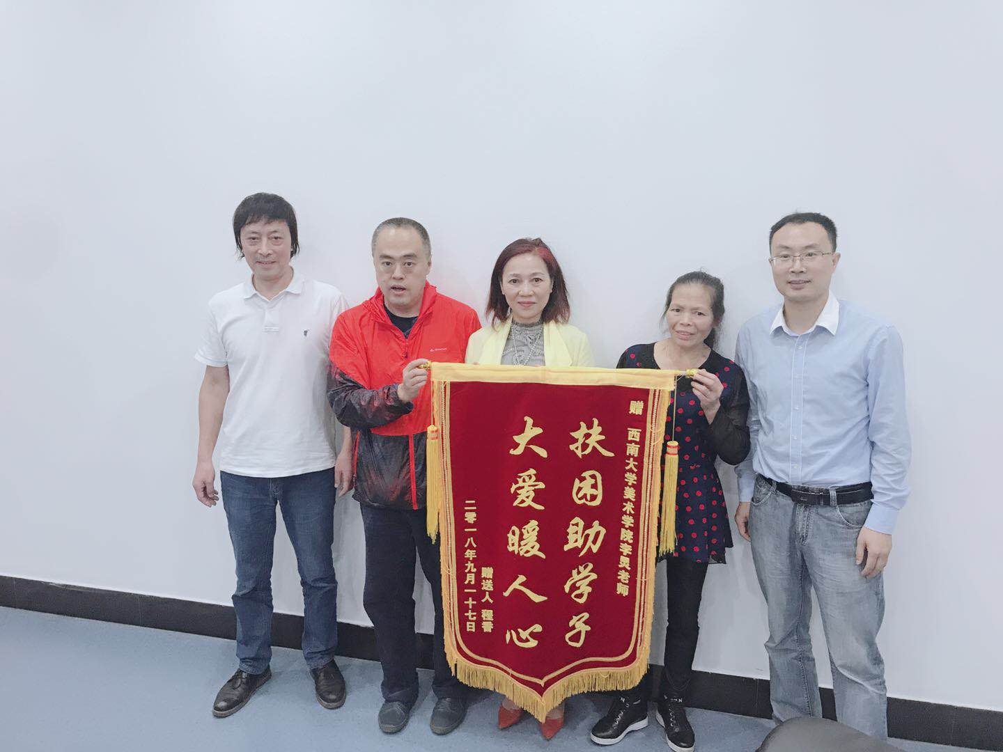 9月17日上午,2018年重庆市非遗传承人群培训班(蜀绣)学员程香的母亲在手语翻译吕游老师的陪同下,专程赶到美术学院,感谢培训班负责人李炅副教授在培训期间给予程香的细心照顾,并赠送一面锦旗。