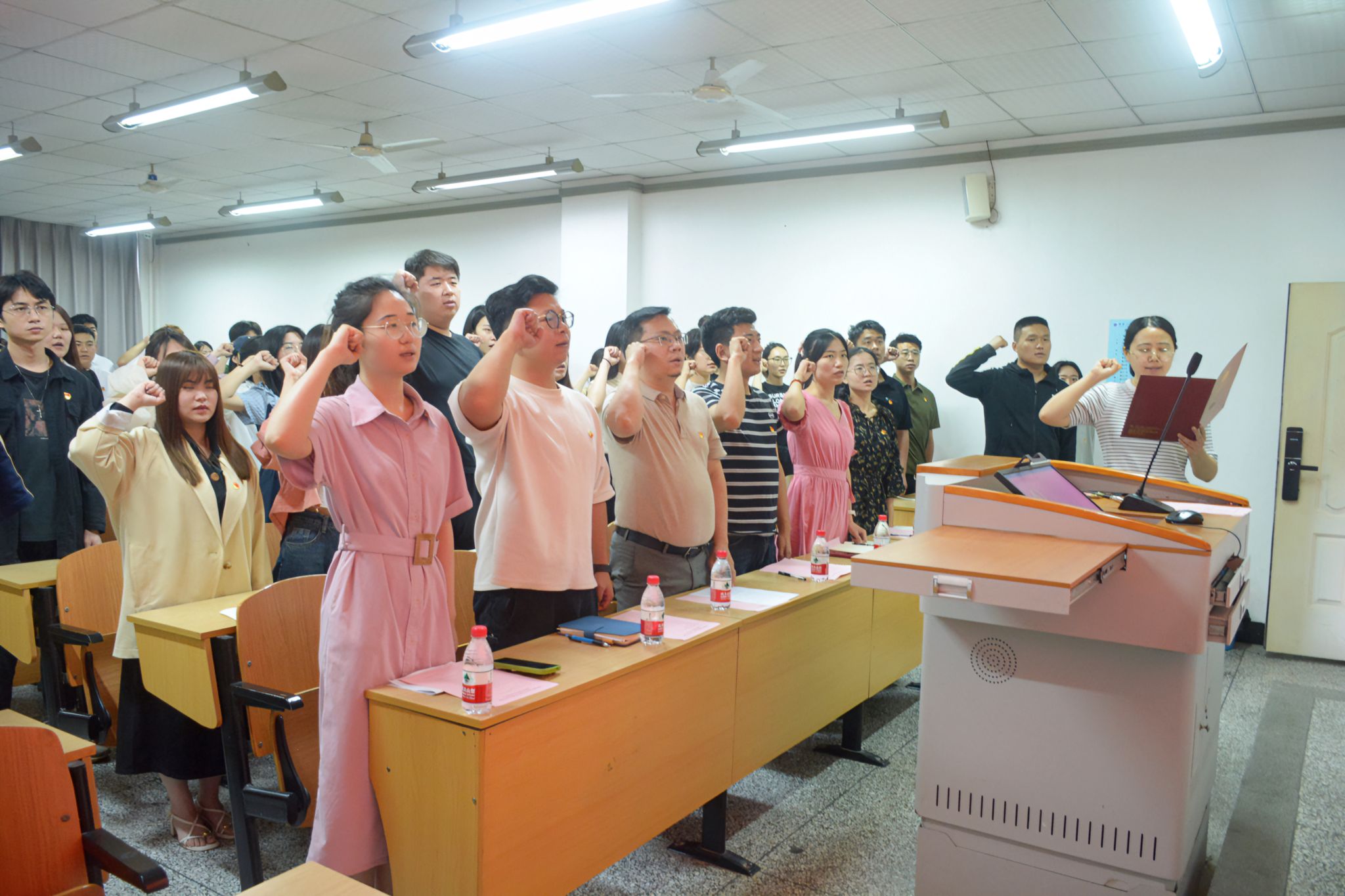 会议伊始,举行预备党员集中宣誓活动。在雄壮的国际歌后,预备党员面向党旗庄严宣誓,正式党员重温入党誓词。全体党员举起右拳,用最真诚、最坚定的声音许下了郑重誓言,回忆入党初心,表达对党的忠诚和为共产主义奋斗终生的决心。