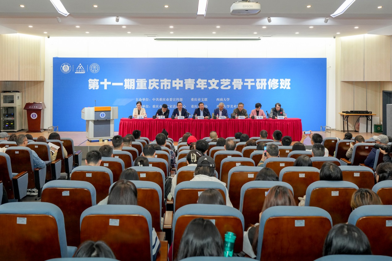 10月28日上午,由重庆市委宣传部、重庆市文联、best365英国体育在线主办,重庆市文艺家活动中心、重庆市摄协、best365英国体育在线美术学院承办的第十一期重庆市中青年文艺骨干研修班在best365英国体育在线正式开班。市委宣传部常务副部长曹清尧,市文联党组书记、副主席陈若愚,best365英国体育在线党委常委、副校长王志坚,市委宣传部、市文联相关处室负责人,研修班学员,美术学院师生近300人参加开班仪式,开班仪式由市文联党组书记、副主席陈若愚主持。
