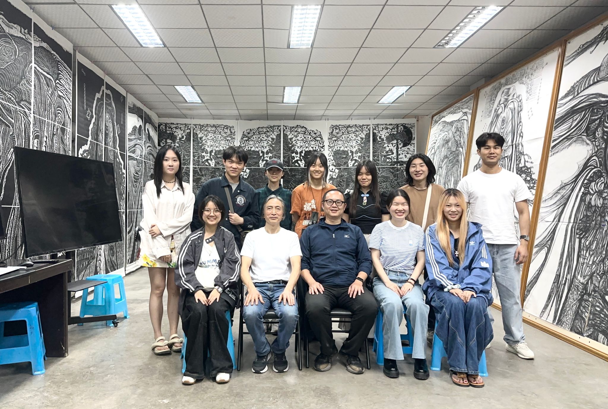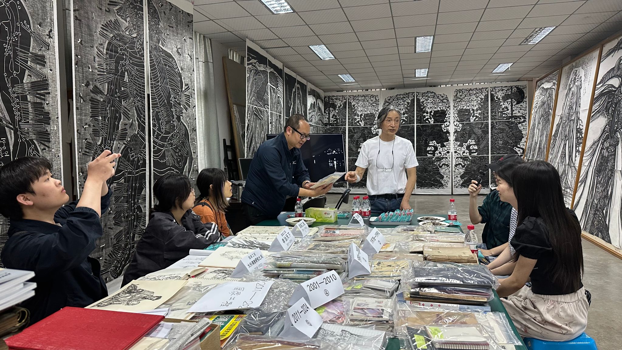戴政生教授与李建卫老师对黄洋副教授一行表示热烈欢迎,并详细介绍了“华夏先贤系列”、“门神系列”、“针灸系列”、“大兴调查研究之风”等巨幅素描和版画的创作背景及历程。随后,黄洋副教授介绍了其带领师生前往四川、重庆等地艺术考察的经历。师生围绕“主题性美术创作”、“科研创新”等问题展开广泛研讨。