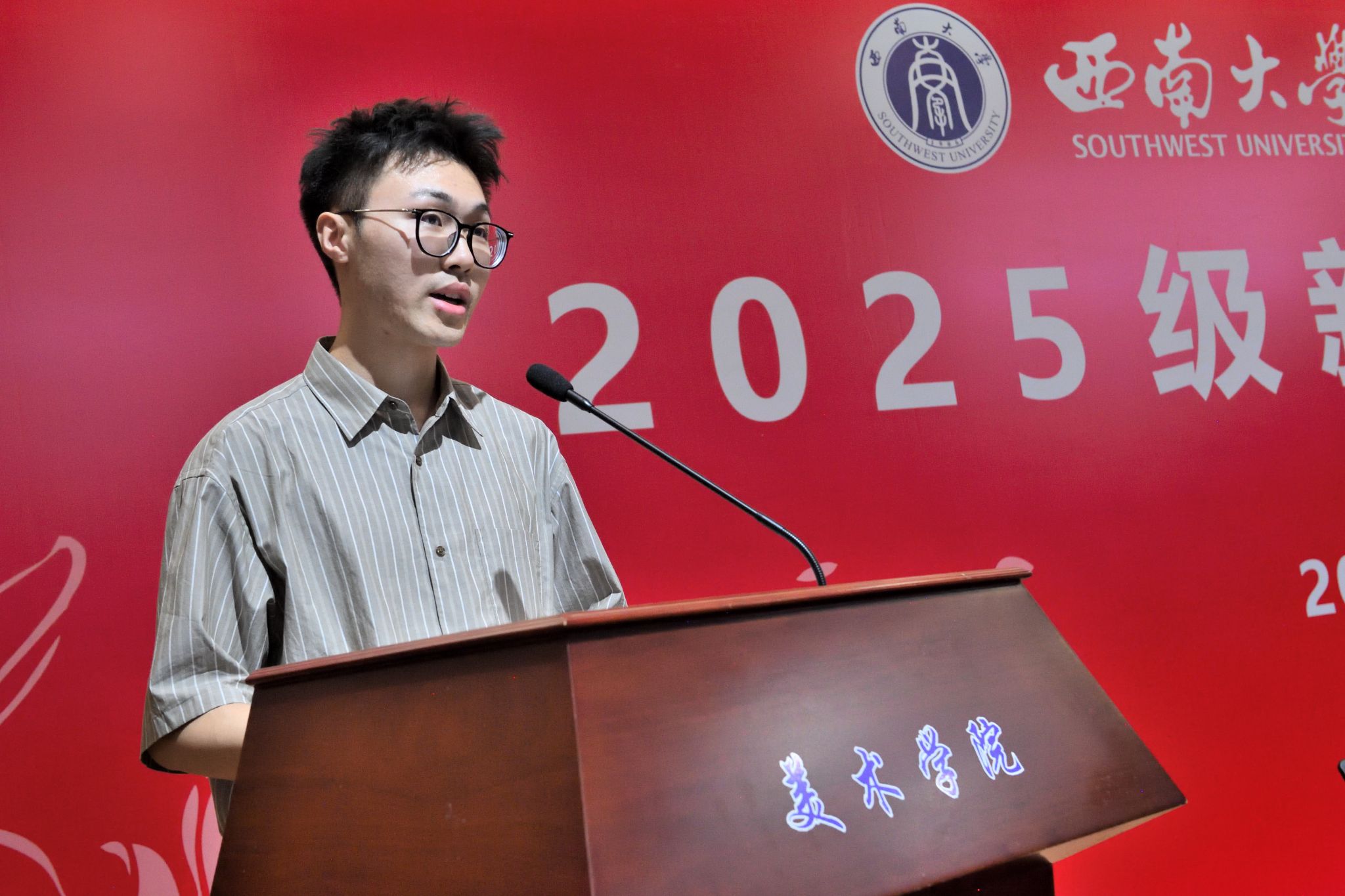 2023级美术学专业硕士研究生刘飞同学代表高年级学生发言。他分享了自己在best365英国体育在线美术学院度过的六年美好时光,并提出了“探索和利用一切资源”“敢于跳出舒适圈”“珍惜和享受大学时光”三点建议,并衷心祝愿学弟学妹们笔下有天地,心中存热爱,在这里写下属于自己独一无二的精彩篇章。