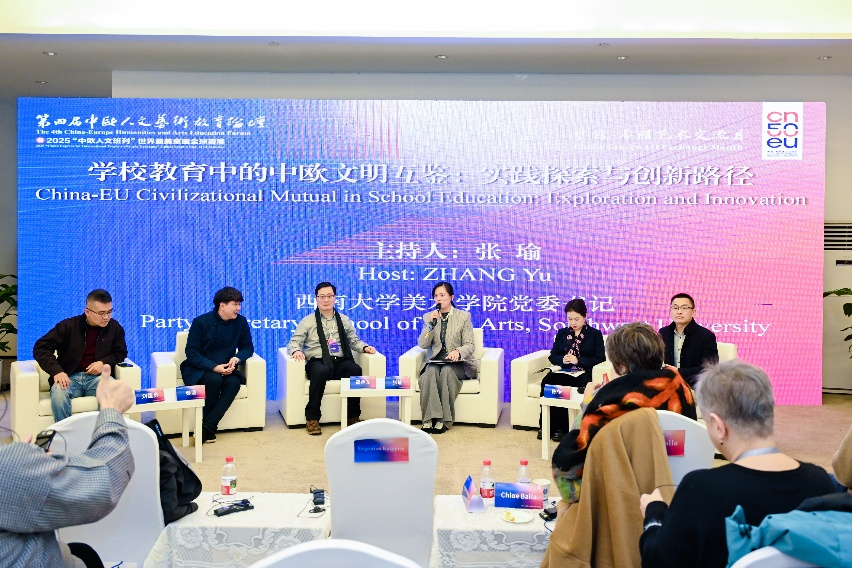 学院党委书记张瑜主持了 “学校教育中的中欧文明互鉴:实践探索与创新路径”的圆桌论坛。圆桌论坛邀请到了来自北京第二外国语学院党委常委、副校长郑承军、重庆市巴蜀小学校教育集团副校长陈怡、best365英国体育在线附属中学副校长刘建勇、重庆两江新区童心小学党总支书记、总校长秦波、中希文明互鉴中心特聘专家胡航教授,论坛嘉宾分享了在中小学及高校艺术教育一线推动文明互鉴的实践经验,并就未来课程设计、教学创新与国际合作的可能路径与现场来自希腊的艺术家们进行了富有建设性的探讨。
