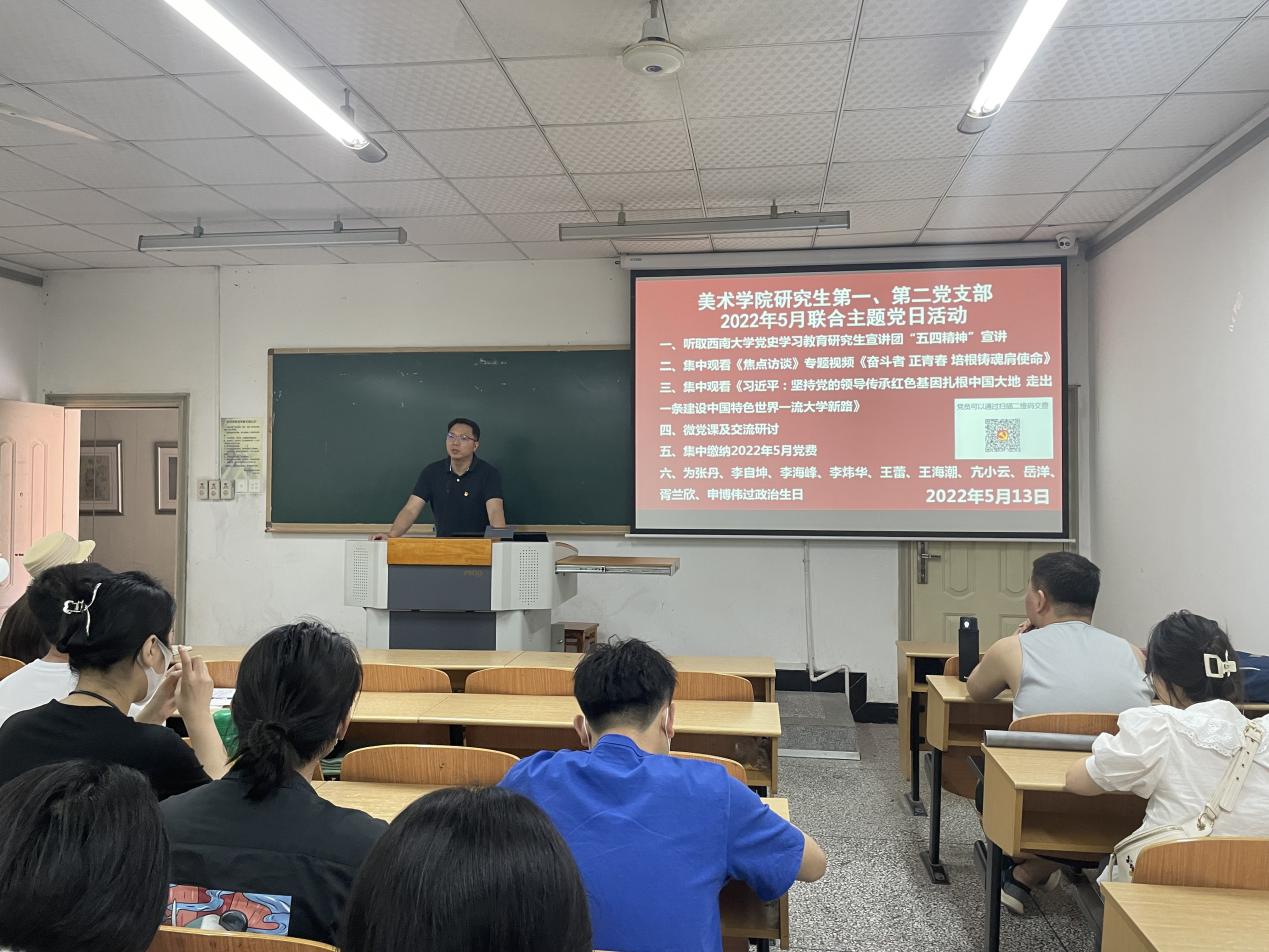 会议伊始,best365英国体育在线党史学习教育研究生宣讲团以“峥嵘岁月传薪火·聚梦青春新青年”为主题宣讲五四精神。宣讲团成员张帅回顾了五四运动的始末,深刻诠释了五四精神,勉励青年党员们不忘初心、牢记使命、以实际行动践行五四精神,创造新的文艺高峰。