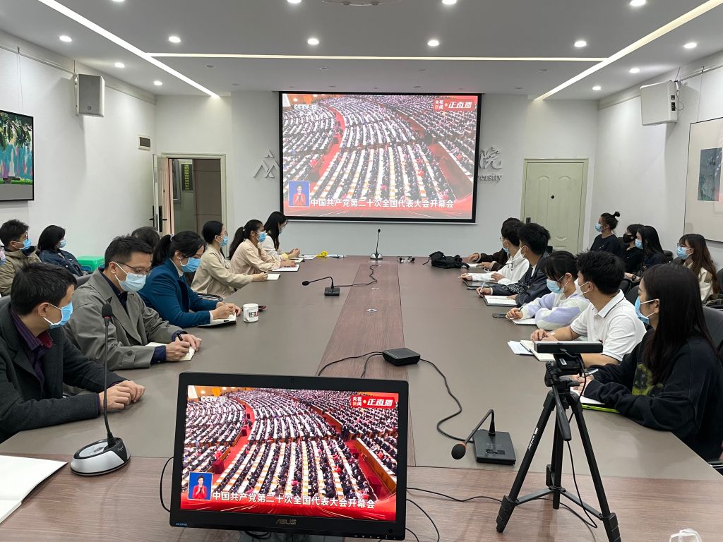 10月16日上午,学院在214会议室召开2022年第六次党委理论学习中心组学习研讨会。会上,集中收看了党的二十大开幕会盛况,并围绕习近平总书记在中国共产党第二十次全国代表大会上的报告逐一谈学习感受。会议由党委书记张瑜主持,全体领导班子成员参会。