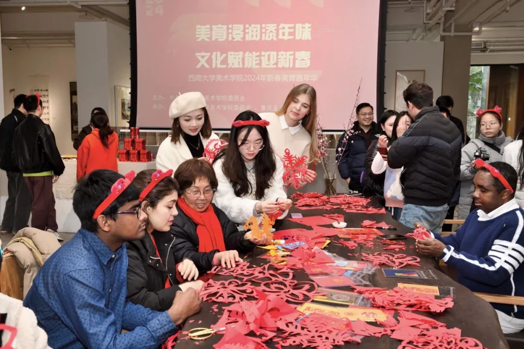 2月2日下午,“美育浸润添年味,文化赋能迎新春”美术学院2024年新春美育嘉年华在重庆圭来艺术馆举办。校团委书记于涛,学院党委书记张瑜,党委副书记、纪委书记经刚,学院留校师生,学校部分留学生等30余人参与了活动。