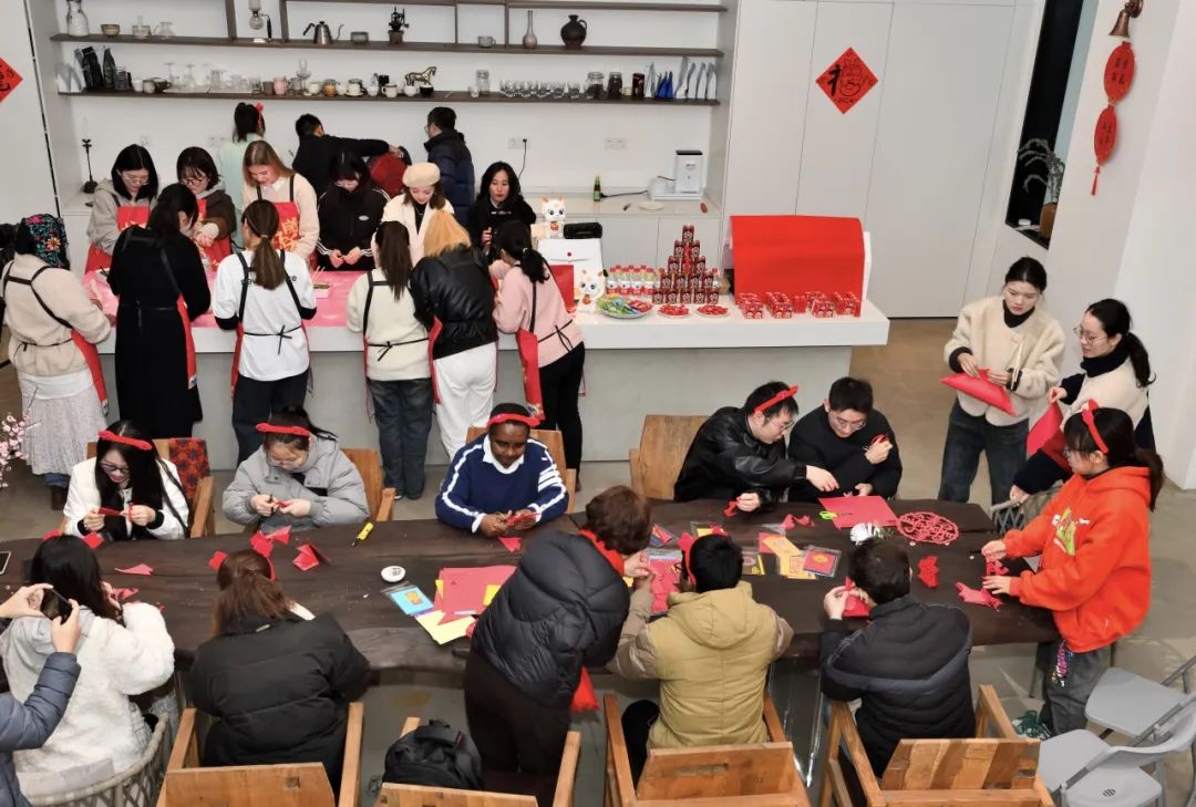 走进圭来艺术馆,映入眼帘的是正在展出的北碚历代书画精品,这场跨年书画作品展为新春注入了浓浓的文化味。艺术馆一楼展厅活动区内,现场布置年味满满,设有主题打卡点,吸引了在场师生拍照打卡,写下新年愿望,定格美好瞬间。嘉年华活动以“美育浸润”和“文化赋能”为主线,组织了包饺子、剪窗花等传统文化体验项目,在热闹喜庆的氛围中,学院师生与留学生一同寻年味、赏民俗、迎新春。